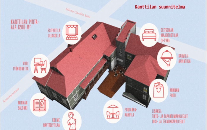 Arkkitehti-ja toimintasuunnitelmat sisältävät Minnan Salongin, majoitus- ja työtiloja, kahvilan ja ullakon esitystilan sekä näyttelytilaa.